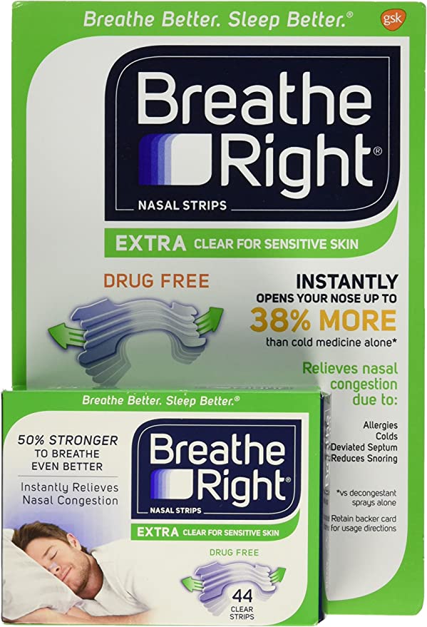Extra Clear For Sensitive Skin contains an extra “spring-like” band and is 50 percent stronger than Original Tan. For noses that need a little extra help in opening their nasal passages. Extra Clear nasal strips work the same way tan strips do. However, the materials used are slightly different, making clear strips easier to remove, which can be beneficial for people with dry or sensitive skin. Drug free and safe to use with any medicine. Instantly relieves nasal congestion due to: Allergies, colds, deviated septum. Reduces snoring due to nasal congestion. Extra Clear Nasal Strips are a drug-free, non-prescription device that works mechanically – from the outside – to gently open nasal passages. This reduces the resistance to air flowing through the nasal passages and improves the ability to breathe through the nose. Extra Clear Nasal Strips for Sensitive Skin: 50% stronger to help you breathe even better For sensitive skin Relief from nasal congestion caused by colds or allergies Reduced snoring caused by nighttime nasal congestion Drug free Easy open flip-top box and easy open zip strip
